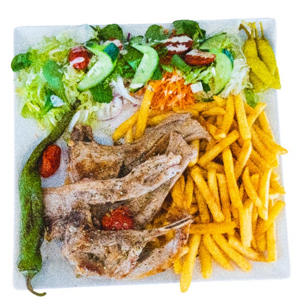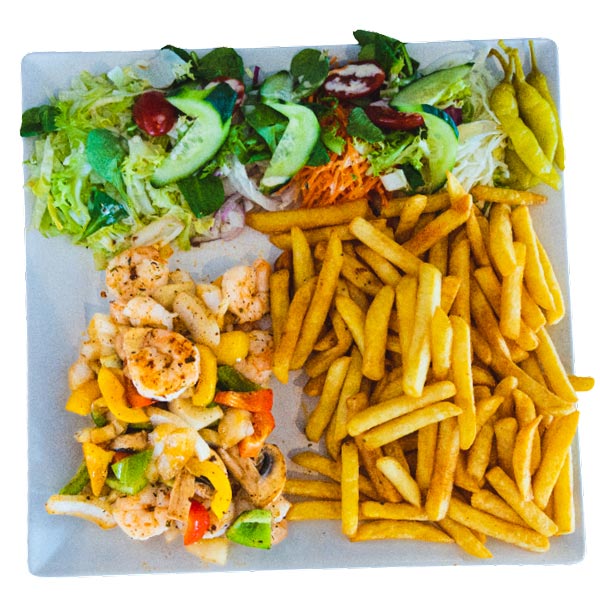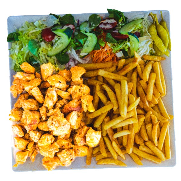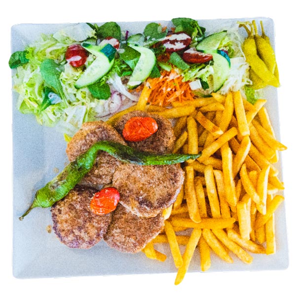 Alle schotels worden geserveerd met salade, friet of rijst en saus